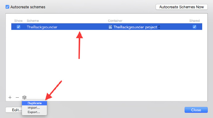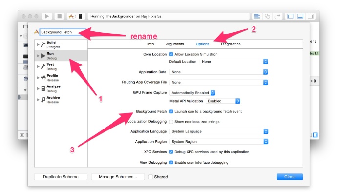 另一种方法是在从挂起状态回复的时候测试后台获取.这里有一个启动项让你APP一运行就直接进入挂起状态.因为你可能要测试这种临界状态,用这个选项始终建立新的Scheme是最好的.Xcode使这种情况很容易实现.