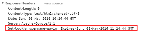 // set-cookie:username=gavin; expires=sun, 08-may-2016 11:35:55 gmt
