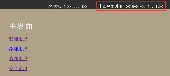 **例子:保存用户登录时间:** 改进用户管理,使用cookie保存某个用户上次登录的时间,用于下次登录显示。 在用户主界面加上如下代码: