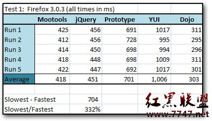 对,与其他库相比,YUI 真的很慢。仔细查看每个测试,找出为什么这个库在选择元素组(例如 “p, a”)时非常慢。对于要求具有很好性能的页面而言,这个库是最差的选择。 - 结论 2:Mootools、jQuery 和 Dojo 的运行时间几乎一样。