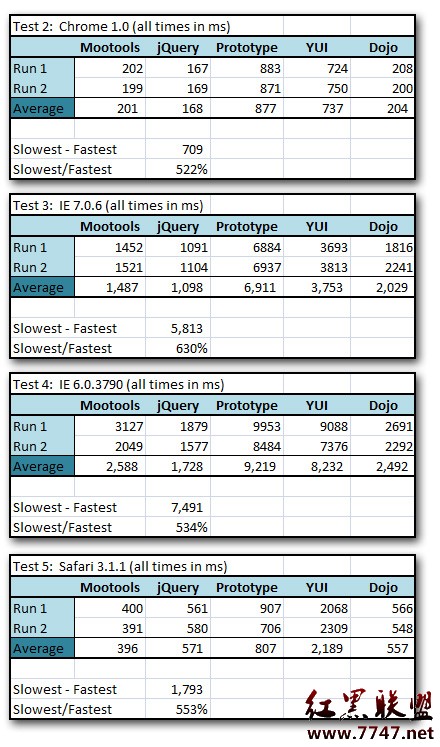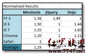 根据以上的平均值,选择这 3 个库之一比选择另外两个库之一能够获得更多的性能优势。从在所有浏览器上运行得出的平均值看,它们的性能是相当的。因此,当您选择 JavaScript 库时,选择这 3 个库之一是不会错的。