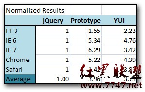 看看这两个库在 5 个浏览器中的测试结果与 jQuery 的对比。在求取它们的平均值之后,您可以发现这两个库的性能差别有多大。它们在任意浏览器中平均比 jQuery 慢 300%。