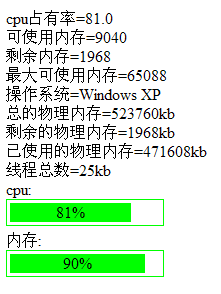 运行下MonitorBeanImpl类,读者将会看到当前的内存、cpu利用率等信息。
