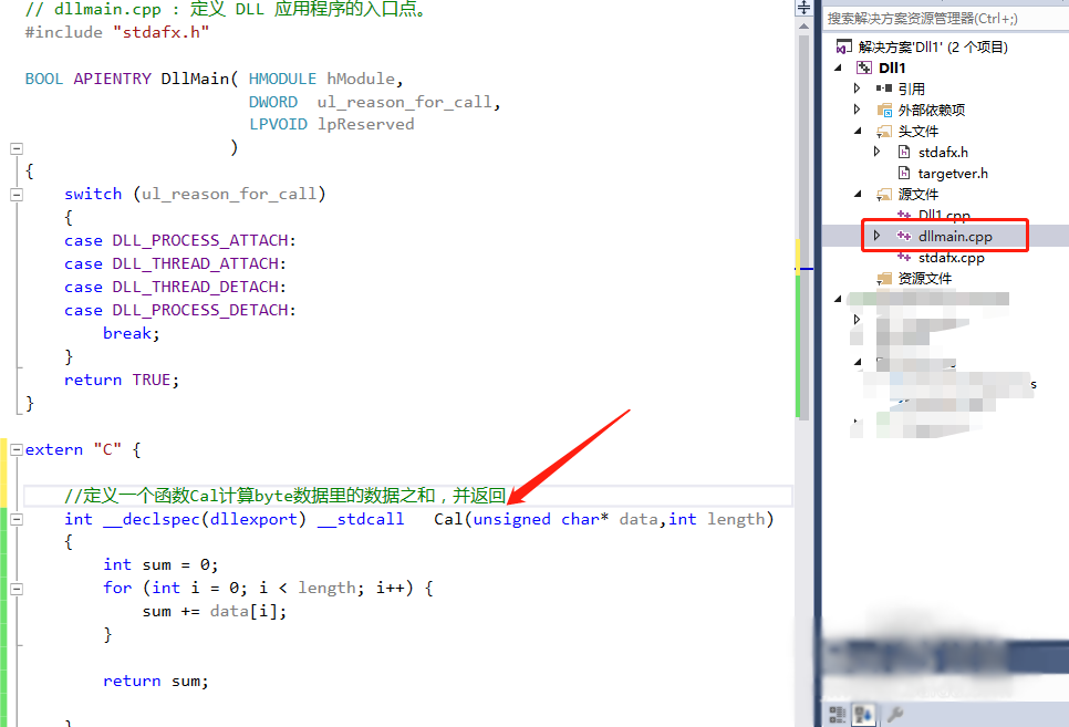 2、打开dllmain.cpp,增加一个byte数组元素求和的函数: Cal(unsigned char* data,int length);编译,在工程名上右键选择“生成”;即生成Dll1.dll文件。