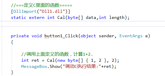 4、采用DllImport引用上面封装好的dll,并调用Cal函数,传入byte[]数组{1,2}。显示出计算结果。预期输出结果为3。