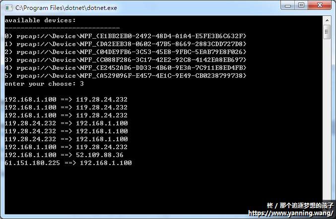 启动上面的代码,选择需要捕获数据包的网卡,就可以看到此网卡上所有IP报文记录及其源地址与目标地址了:
