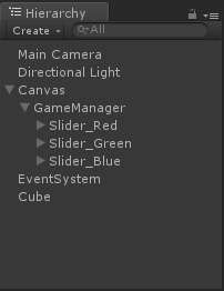 首先我们创建三个Slider 和一个Cube,为了方便查看,我把Slider下面的Handle分别改变颜色并和名字一一对应;