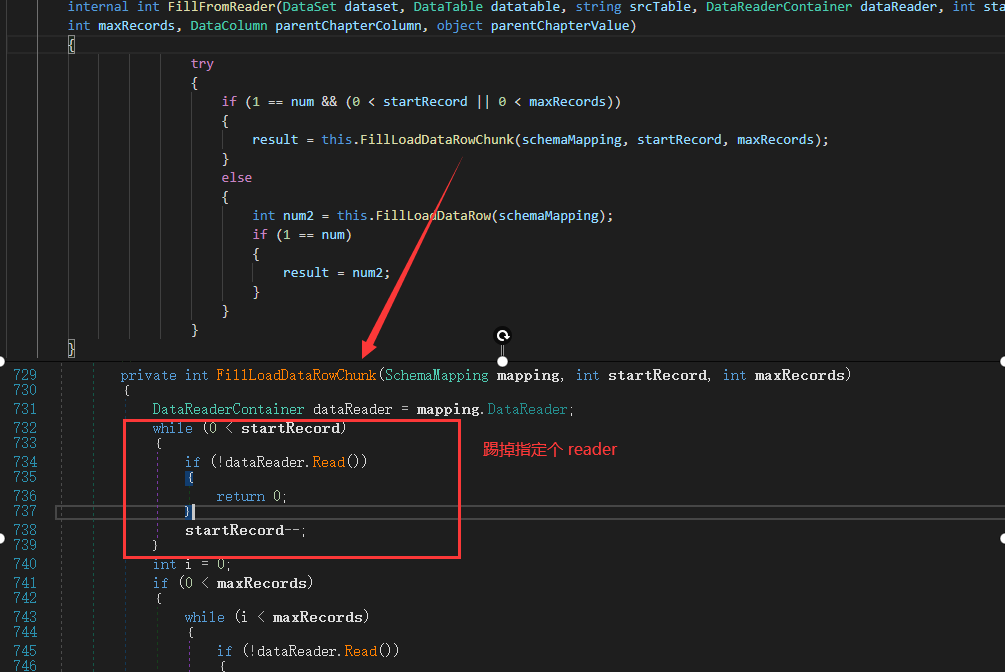 - this.fill(datatables, datareader, startrecord, maxrecords) 中可以看到,底层不出意外也是通过 datareader.read() 一行一行读取然后塞到 datatable中去的,不然它拿这个 datareader 干嘛呢? 不信的话可以继续往下追。