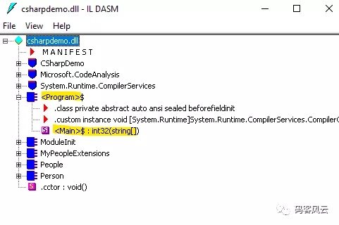 需要注意的是,这里的类名program和方法名main只是用来举例,其实在编译器生成的不是这个名字。我们可以通过查看il代码确认这一点: