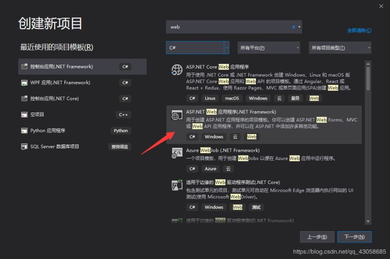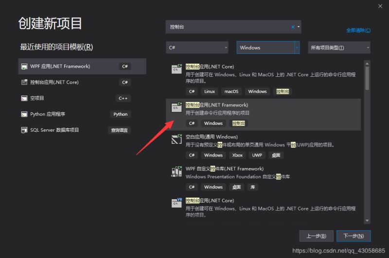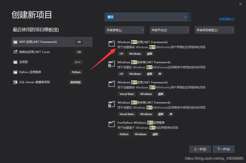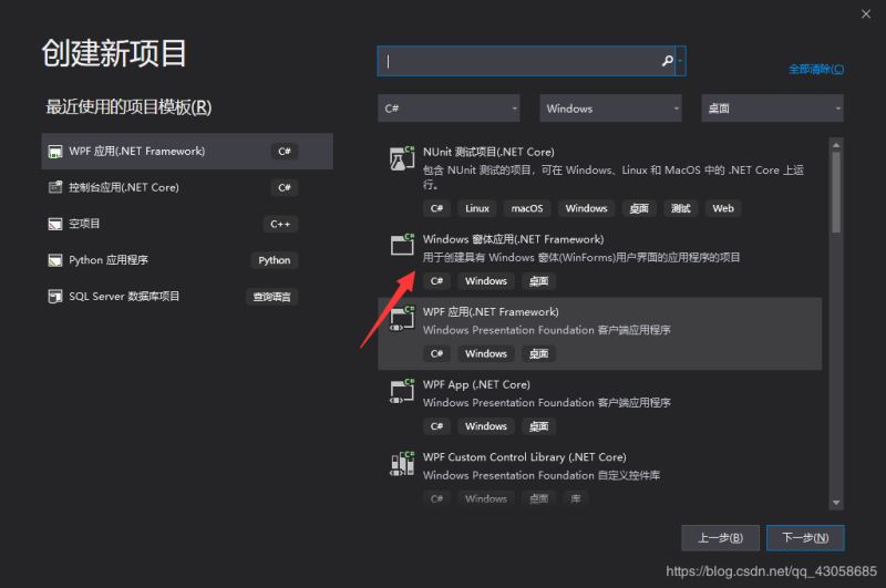 可以直接在搜索框输入关键字进行搜索,选择 windows 窗体应用(.net framework)。如图。