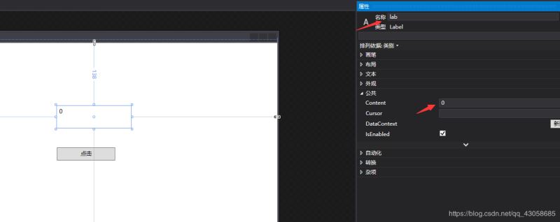 首先从属性那边拖动两个空间到窗口上,分别是button和label。并把它们的名称和内容分别修改为(btn,点击)和(lab,0)