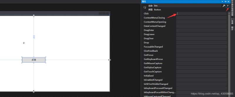 可以从属性窗口那,点击右上角的闪电图标,然后点击clike的按钮,如图。或者直接双击按钮。