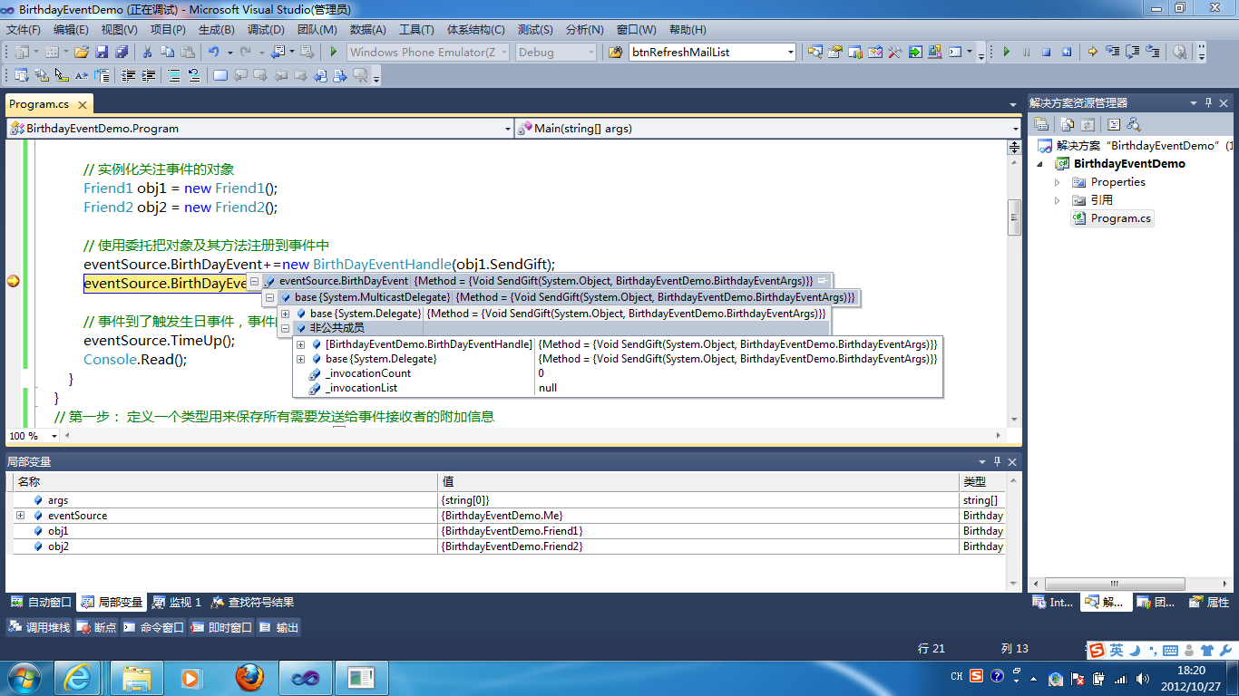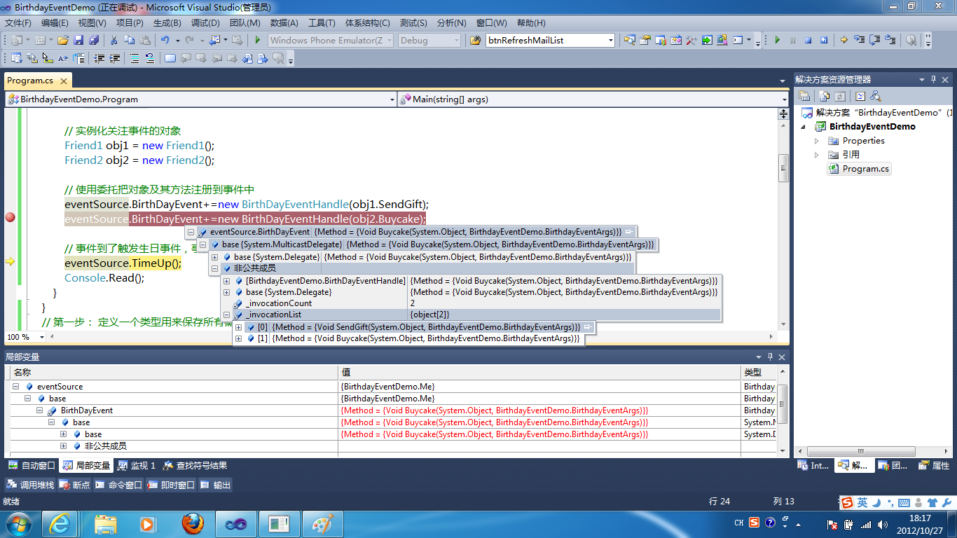 同时大家也可以通过调试来说明事件是一个委托链的,大家可以在 eventsource.birthdayevent+=new birthdayeventhandle(obj2.buycake);这行代码设置一个断点调试的,下面是我调试过程中的一个截图,大家也可以自己调试看看的,这样将会更加理解事件是一个委托链的概念: