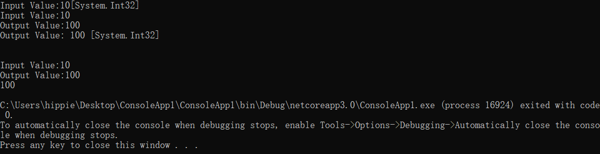 console.writeline($"output value: {output} [{output.gettype()}]");
