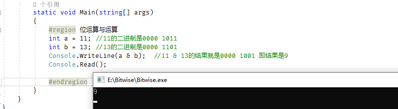 #region 位运算与运算 int a = 11; //11的二进制是0000 1011 int b = 13; //13的二进制是0000 1101 console.writeline(a & b); //11 & 13的结果就是0000 1001 即结果是9 console.read(); #endregion