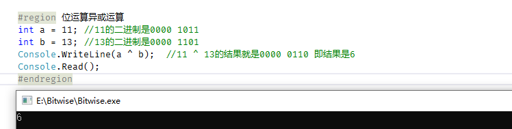 console.writeline(a ^ b); //11 ^ 13的结果就是0000 0110 即结果是6