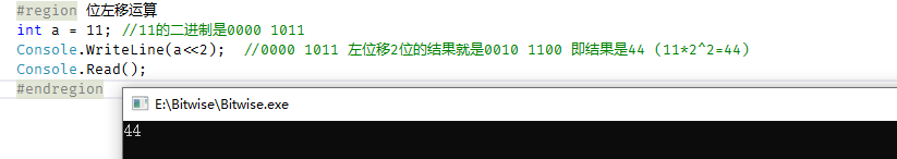 console.writeline(a << 2); //0000 1011 左位移2位的结果就是0010 1100 即结果是44 (11*2^2=44)