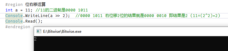 console.writeline(a >> 2); //0000 1011 右位移2位的结果就是0000 0010 即结果是2 (11÷(2^2)=2)
