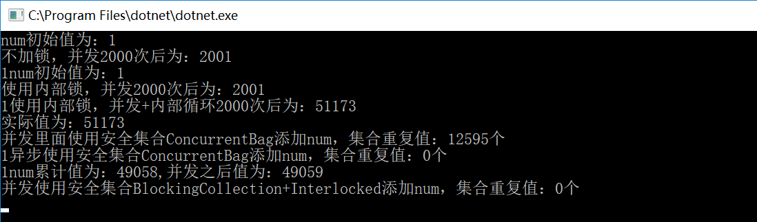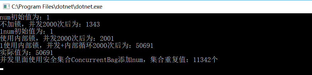 console.writeline($"不加锁,并发{list.count}次后为:" + num.tostring());