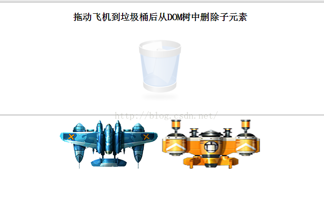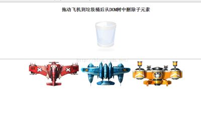模拟电脑中 ”垃圾桶“的效果, 总共显示三个小飞机,拖动着某个小飞机到垃圾桶上方后,小飞机从dom树上删除