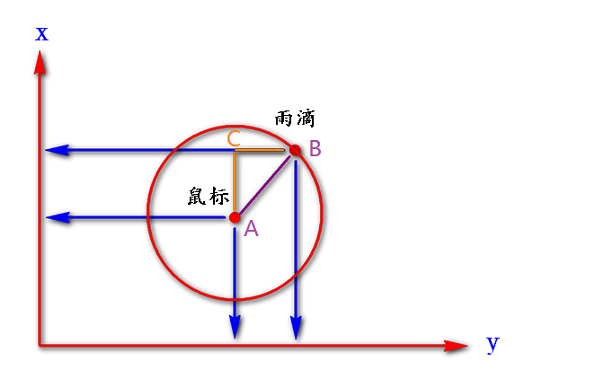 我们知道雨滴到鼠标的直线距离后,和圆的半径比较下,大于半径就不在范围内,否则就是在了。