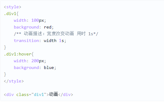 这里hover事件时改变宽度和背景颜色,用transition来描述动画,由于我们只对width进行了描述,所以背景色,鼠标指上去,会立马变色,并不会有渐变的过程。