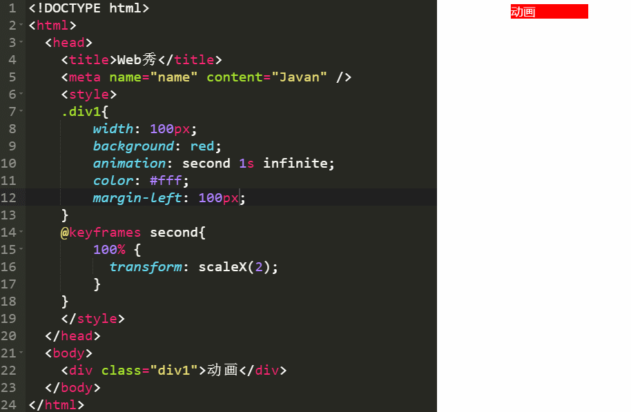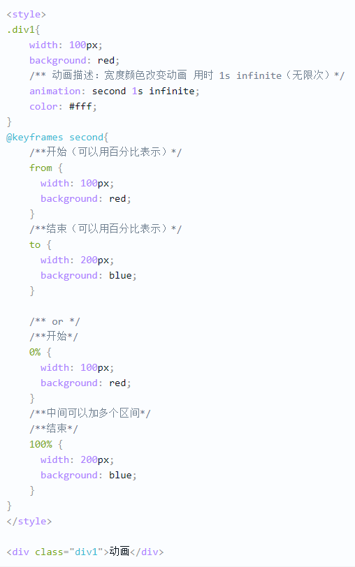 这里动画从加载就开始执行,所以用了animation,改变宽度和背景色,用时1s,并且无限次循环执行。@keyframes规则是创建动画。