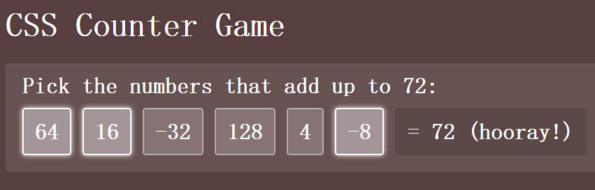 今天给大家分享一款纯css3实现的数字统计游戏。这款游戏的规则的是将所有的数字相加等于72。这款游戏的数字按钮做得很美观,需要的时候可以借用下。一起看下效果图: