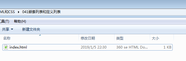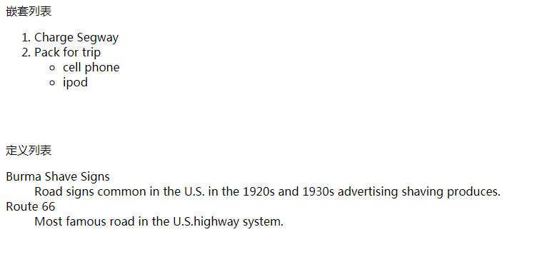 1 <html> 2 <head> 3 <title>test</title> 4 </head> 5 <body> 6 <!--嵌套列表--> 7 <p> 8 嵌套列表 9 </p> 10 <ol> 11 <!--在<ol>以内并且在<ul>以外的<li>属于有序列表--> 12 <li>charge segway</li> 13 <li>pack for trip</li> 14 <!--在<ul>以内的是无序列表--> 15 <ul> 16 <li>cell phone</li> 17 <li>ipod</li> 18 </ul> 19 </ol> 20 <br> 21 <br> 22 <p> 23 定义列表 24 </p> 25 <dl> <!--定义列表--> 26 <dt>burma shave signs</dt> <!--无缩进--> 27 <dd>road signs common in the u.s. in the 1920s and 1930s advertising shaving produces.</dd> 28 <dt>route 66</dt> 29 <dd>most famous road in the u.s.highway system.</dd> <!--有缩进--> 30 </dl> 31 </body> 32 </html>