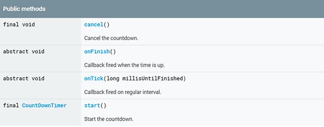 CountDownTimer 实现倒计时功能的机制也是用Handler 消息控制,只是它帮我们已经封装好了,先看一下它的介绍。