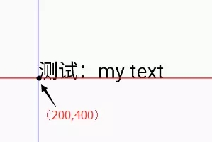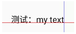 Paint paint=new Paint(); paint.setStyle(Paint.Style.FILL); paint.setStrokeWidth(12); paint.setTextSize(100); String text="测试:my text"; canvas.drawText(text, 200, 400, paint); //画两条线标记位置 paint.setStrokeWidth(4); paint.setColor(Color.RED); canvas.drawLine(0, 400, 2000, 400, paint); paint.setColor(Color.BLUE); canvas.drawLine(200, 0, 200, 2000, paint);