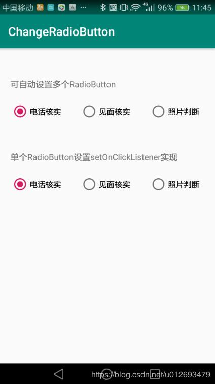 第二种采用的是RadioGroup.getChildAt(i)的方式设置所有Radiobutton的setOnClickListener方法。这样比较灵活,不管是有多少Radiobutton,也不需要额外的操作。
