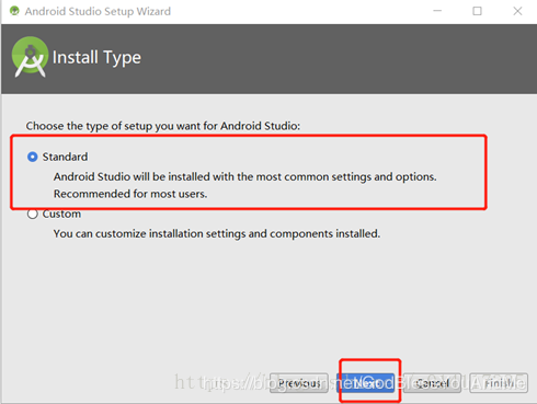 9、选则下载SDK和其他工具,选择Standard即按照大多数开发者习惯进行下载,如果C盘控件足够大的话可以选择,否则的话选择Custom,指定其他盘符下如D:/androidSDK,然后next