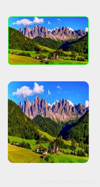 ImageView iv = findViewById(R.id.iv); Bitmap bitmap =BitmapFactory.decodeResource(getResources(), R.drawable.fengjing); Bitmap outBitmap =getRoundBitmapByShader(bitmap, 500,300,20, 3); iv.setImageBitmap(outBitmap);