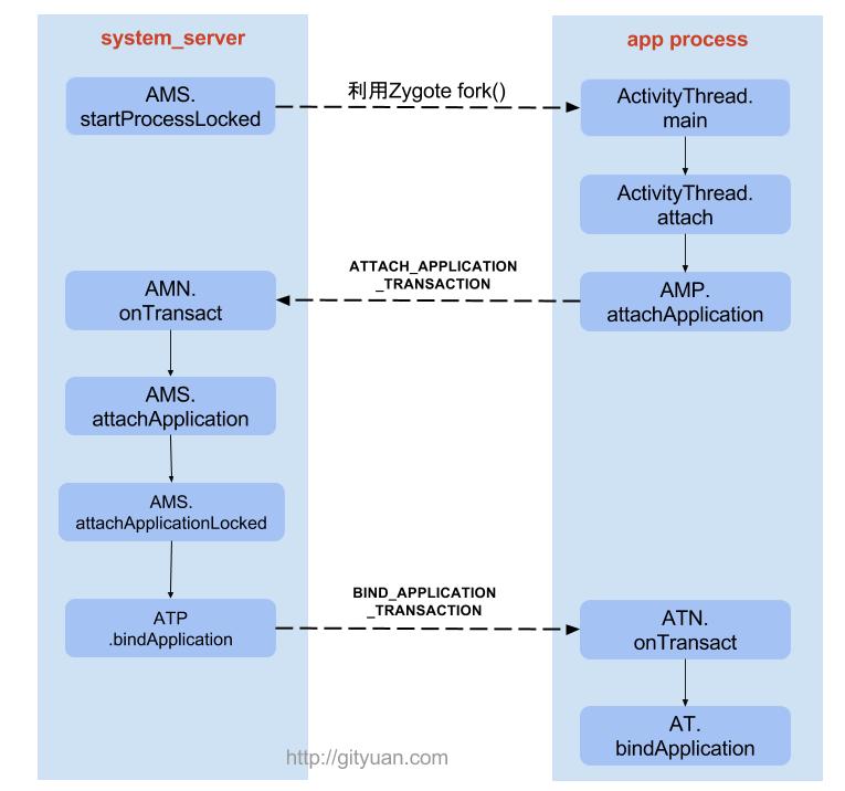 - 创建完新进程后fork返回两次, 在新进程app process向servicemanager查询system_server进程中binder服务端AMS,获取相对应的Client端,也就是AMP. 有了这一对binder c/s对, 那么app process便可以通过binder向跨进程system_server发送请求,即attachApplication()