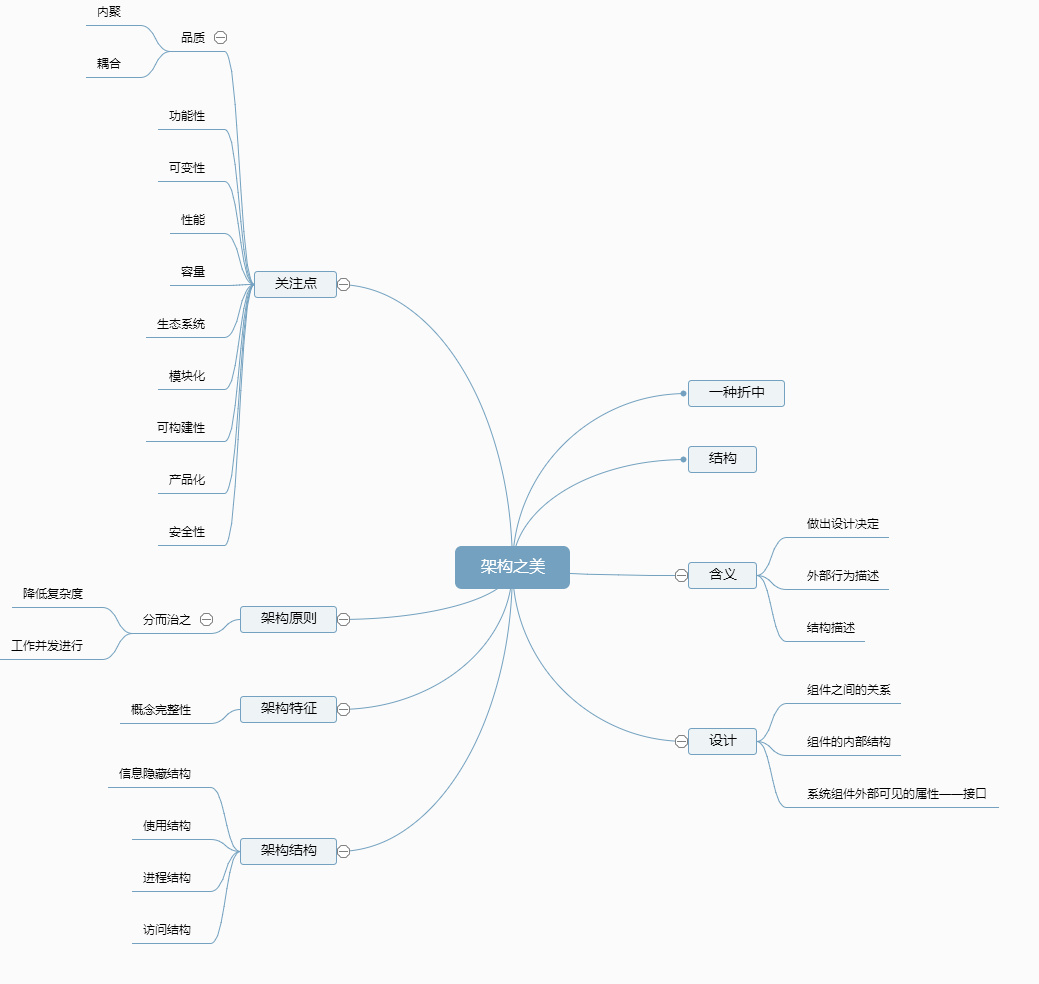 仅看完了《架构之美》的第一部分:论架构,对架构有了一个大概的认识。下图是这部分的知识点概要: