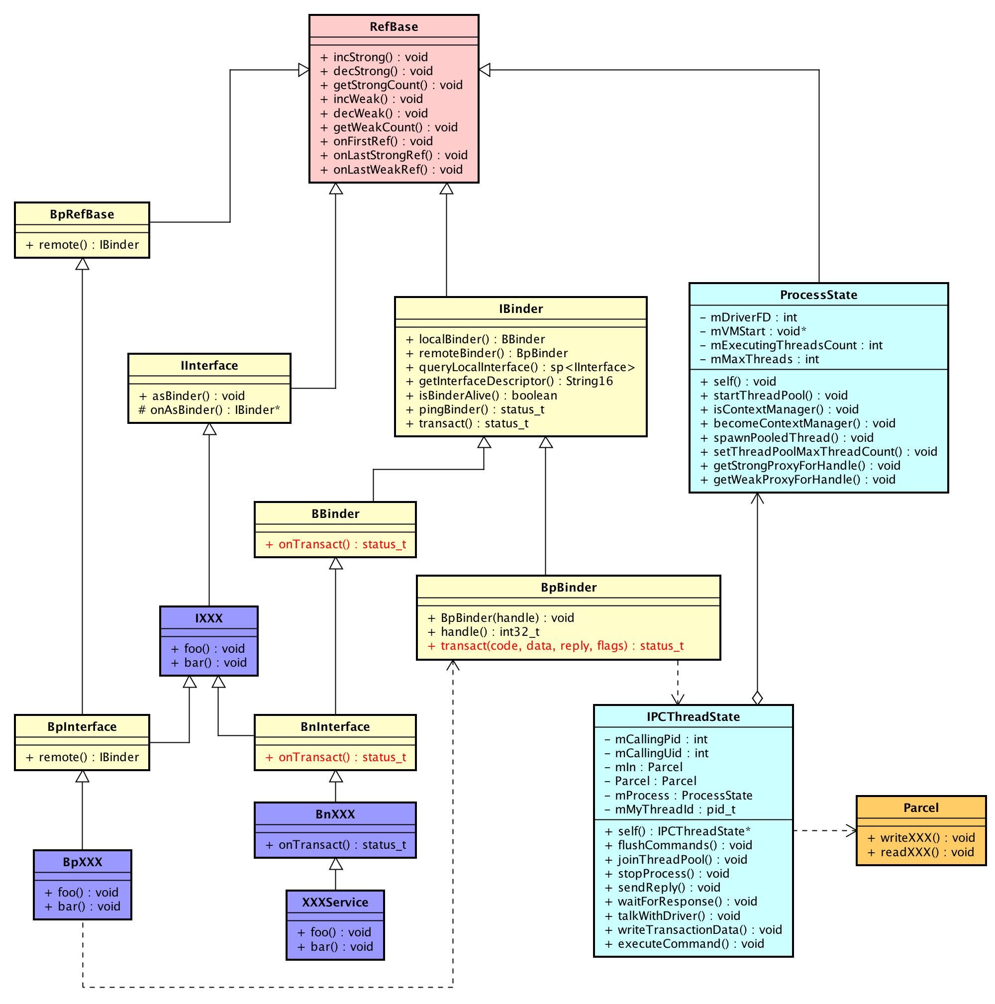 | IPCThreadState | 代表了使用Binder的线程,这个类中封装了与Binder驱动通信的逻辑 |