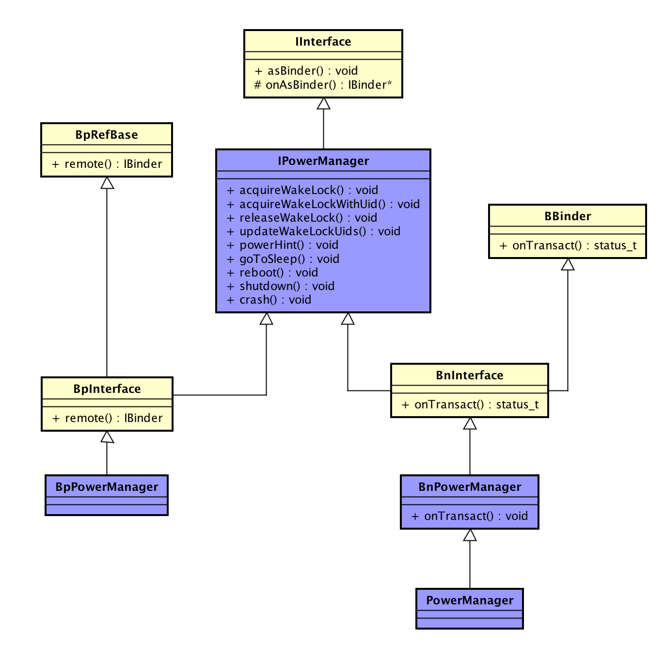 之所以要继承自IInterface类是因为这个类中定义了onAsBinder让子类实现。onAsBinder在本地对象的实现类中返回的是本地对象,在远程对象的实现类中返回的是远程对象。onAsBinder方法被两个静态方法asBinder方法调用。有了这些接口之后,在代码中便可以直接通过IXXX::asBinder方法获取到不用区分本地还是远程的IBinder对象。这个在跨进程传递Binder对象的时候有很大的作用(因为不用区分具体细节,只要直接调用和传递就好)。