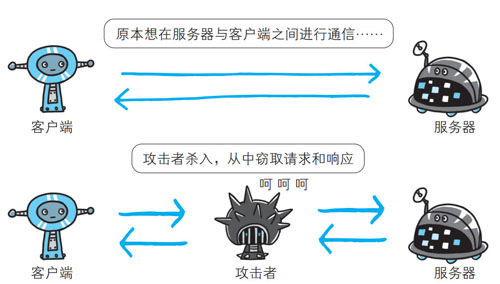 比如,从某个Web网站下载内容,是无法确定客户端下载的文件和服务器上存放的文件是否前后一致的。文件内容在传输途中可能已经被篡改为其他的内容。即使内容真的已改变,作为接收方的客户端也是觉察不到的。像这样,请求或响应在传输途中,遭攻击者拦截并篡改内容的攻击称为中间人攻击(Man-in-the-Middle attack,MITM)。