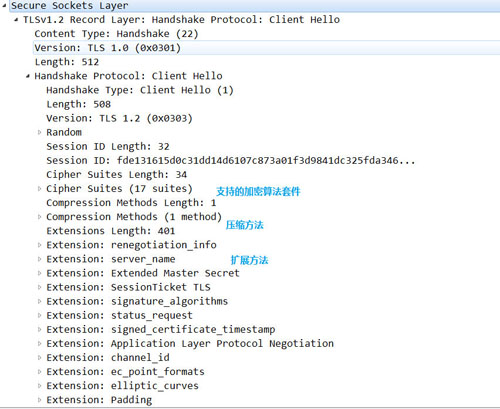 在握手流程中,ClientHello是第一条消息。这条消息将客户端的功能和首选项传送给服务器。包含客户端支持的SSL的指定版本、加密组件(Cipher Suite)列表(所使用的加密算法及密钥长度等)。