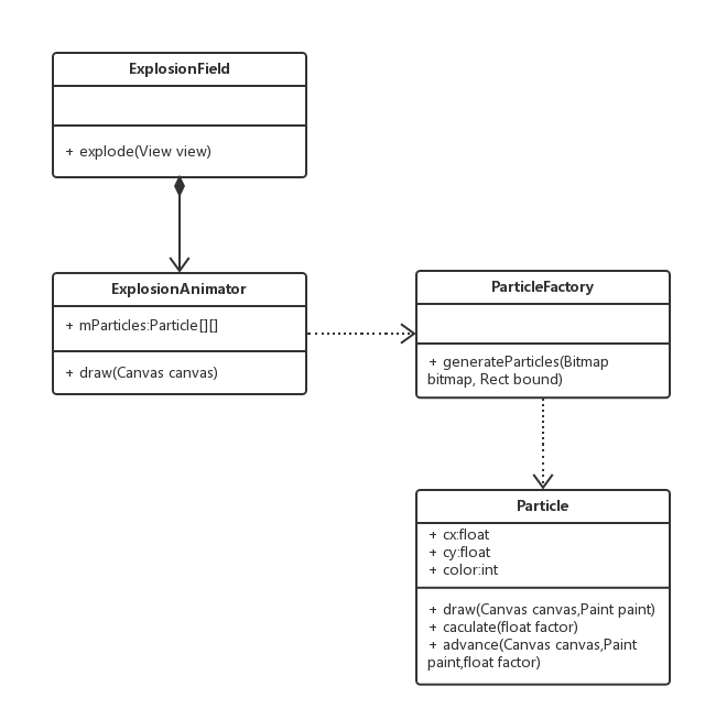 ExplosionAnimator,爆炸动画,其实是一个计时器,继承自ValueAnimator。1024s内,完成爆炸动画,每次计时,就更新所有粒子的运动状态。draw()方法是它最重要的方法,也就是使所有粒子重绘自身,从而实现动画效果。