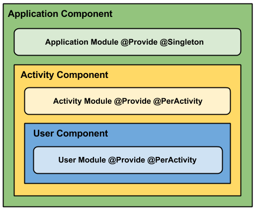 @Component: 是@Inject和@Module的桥梁,它的主要作用就是连接这两个部分。 Components可以提供所有定义了的类型的实例。