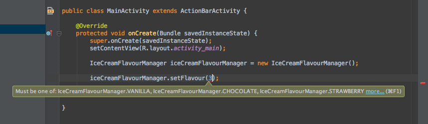 这时如果我们使用错误的整型值调用IceCreamFlavourManager.setFlavour时,IDE将报错如下: