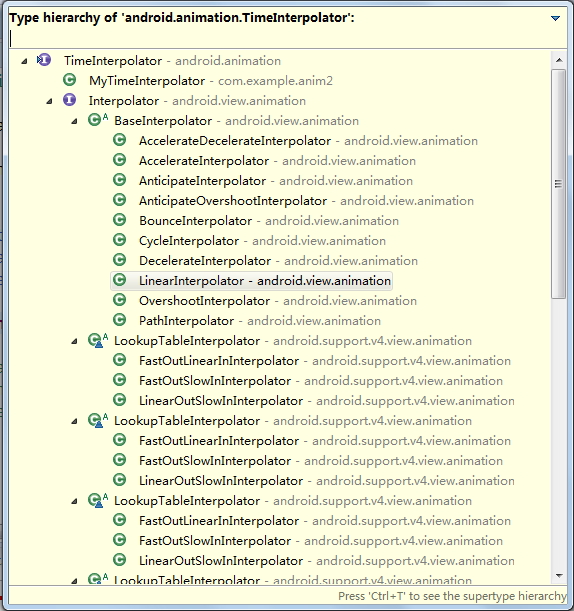 大部分时候,我们使用的系统提供的各种各样的**Interpolator,比如上文说的LinearInterpolator,这些类都是继承自Interpolator,而Interpolator则实现了TimeInterpolator接口,我们来看看一个继承结构图: