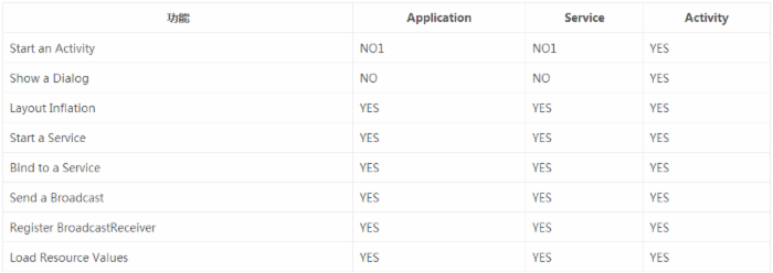 **其中:**NO1表示Application和Service可以启动一个Activity,不过需要创建一个新的task任务队列。而对于Dialog而言,只有在Activity中才能创建