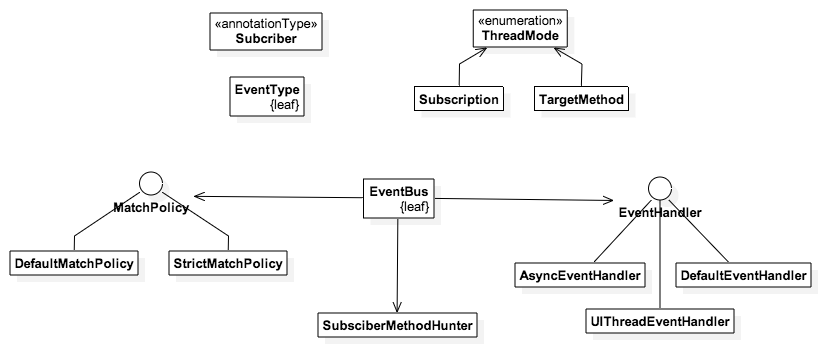 - DefaultMatchPolicy : 默认的匹配策略,发布事件时,EventBus会查找参数是该事件父类的函数,并且构造对应的EventType;
