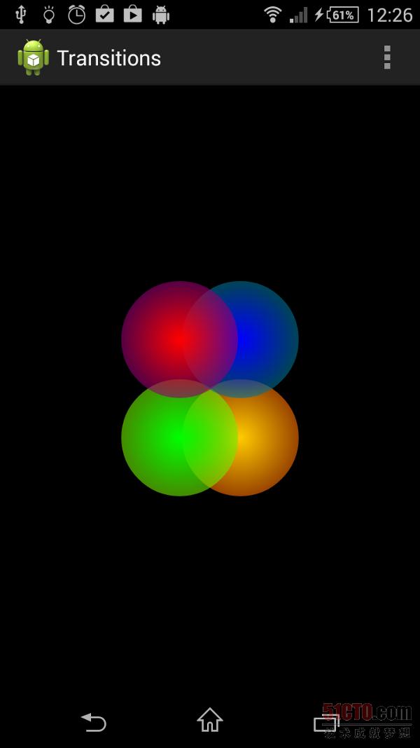现在大家应该已经可以运行自己的应用程序,并在点击任意图形时查看到整个过渡流程。每当我们执行点击操作时,过渡流程就会将各个图形缓慢移动到屏幕上的对角线位置,再次点击则可使其回归原位。