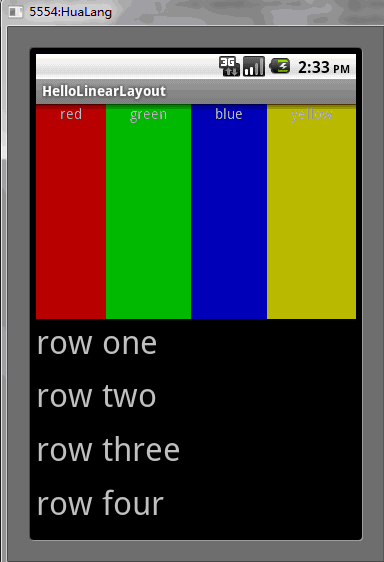 <?xml version="1.0" encoding="utf-8"?> <LinearLayout xmlns:android="http://schemas.android.com/apk/res/android" ? ? android:orientation="vertical" ? ? android:layout_width="fill_parent" ? ? android:layout_height="fill_parent" ? ? > ? ? ? ? <LinearLayout ? ? ? ? ? ? ? ? android:orientation="horizontal" ? ? ? ? ? ? ? ? android:layout_width="fill_parent" ? ? ? ? ? ? ? ? android:layout_height="fill_parent" ? ? ? ? ? ? ? ? android:layout_weight="1"> ? ? ? ? ? ? ? ? <TextView ? ? ? ? ? ? ? ? ? ? ? ? android:text="red" ? ? ? ? ? ? ? ? ? ? ? ? android:gravity="center_horizontal" ? ? ? ? ? ? ? ? ? ? ? ? android:background="#aa0000" ? ? ? ? ? ? ? ? ? ? ? ? android:layout_width="wrap_content" ? ? ? ? ? ? ? ? ? ? ? ? android:layout_height="fill_parent" ? ? ? ? ? ? ? ? ? ? ? ? android:layout_weight="1" ? ? ? ? ? ? ? ? /> ? ? ? ? ? ? ? ? <TextView ? ? ? ? ? ? ? ? ? ? ? ? android:text="green" ? ? ? ? ? ? ? ? ? ? ? ? android:gravity="center_horizontal" ? ? ? ? ? ? ? ? ? ? ? ? android:background="#00aa00" ? ? ? ? ? ? ? ? ? ? ? ? android:layout_width="wrap_content" ? ? ? ? ? ? ? ? ? ? ? ? android:layout_height="fill_parent" ? ? ? ? ? ? ? ? ? ? ? ? android:layout_weight="1" ? ? ? ? ? ? ? ? /> ? ? ? ? ? ? ? ? <TextView ? ? ? ? ? ? ? ? ? ? ? ? android:text="blue" ? ? ? ? ? ? ? ? ? ? ? ? android:gravity="center_horizontal" ? ? ? ? ? ? ? ? ? ? ? ? android:background="#0000aa" ? ? ? ? ? ? ? ? ? ? ? ? android:layout_width="wrap_content" ? ? ? ? ? ? ? ? ? ? ? ? android:layout_height="fill_parent" ? ? ? ? ? ? ? ? ? ? ? ? android:layout_weight="1" ? ? ? ? ? ? ? ? /> ? ? ? ? ? ? ? ? <TextView ? ? ? ? ? ? ? ? ? ? ? ? android:text="yellow" ? ? ? ? ? ? ? ? ? ? ? ? android:gravity="center_horizontal" ? ? ? ? ? ? ? ? ? ? ? ? android:background="#aaaa00" ? ? ? ? ? ? ? ? ? ? ? ? android:layout_width="wrap_content" ? ? ? ? ? ? ? ? ? ? ? ? android:layout_height="fill_parent" ? ? ? ? ? ? ? ? ? ? ? ? android:layout_weight="1" ? ? ? ? ? ? ? ? /> ? ? ? ? </LinearLayout> ? ? ? ? <LinearLayout ? ? ? ? ? ? ? ? android:orientation="vertical" ? ? ? ? ? ? ? ? android:layout_width="fill_parent" ? ? ? ? ? ? ? ? android:layout_height="fill_parent" ? ? ? ? ? ? ? ? android:layout_weight="1"> ? ? ? ? ? ? ? ? <TextView ? ? ? ? ? ? ? ? ? ? ? ? android:text="row one" ? ? ? ? ? ? ? ? ? ? ? ? android:textSize="15pt" ? ? ? ? ? ? ? ? ? ? ? ? android:layout_width="fill_parent" ? ? ? ? ? ? ? ? ? ? ? ? android:layout_height="wrap_content" ? ? ? ? ? ? ? ? ? ? ? ? android:layout_weight="1" ? ? ? ? ? ? ? ? /> ? ? ? ? ? ? ? ? <TextView ? ? ? ? ? ? ? ? ? ? ? ? android:text="row two" ? ? ? ? ? ? ? ? ? ? ? ? android:textSize="15pt" ? ? ? ? ? ? ? ? ? ? ? ? android:layout_width="fill_parent" ? ? ? ? ? ? ? ? ? ? ? ? android:layout_height="wrap_content" ? ? ? ? ? ? ? ? ? ? ? ? android:layout_weight="1" ? ? ? ? ? ? ? ? /> ? ? ? ? ? ? ? ? <TextView ? ? ? ? ? ? ? ? ? ? ? ? android:text="row three" ? ? ? ? ? ? ? ? ? ? ? ? android:textSize="15pt" ? ? ? ? ? ? ? ? ? ? ? ? android:layout_width="fill_parent" ? ? ? ? ? ? ? ? ? ? ? ? android:layout_height="wrap_content" ? ? ? ? ? ? ? ? ? ? ? ? android:layout_weight="1" ? ? ? ? ? ? ? ? /> ? ? ? ? ? ? ? ? <TextView ? ? ? ? ? ? ? ? ? ? ? ? android:text="row four" ? ? ? ? ? ? ? ? ? ? ? ? android:textSize="15pt" ? ? ? ? ? ? ? ? ? ? ? ? android:layout_width="fill_parent" ? ? ? ? ? ? ? ? ? ? ? ? android:layout_height="wrap_content" ? ? ? ? ? ? ? ? ? ? ? ? android:layout_weight="1" ? ? ? ? ? ? ? ? /> ? ? ? ? </LinearLayout> </LinearLayout>