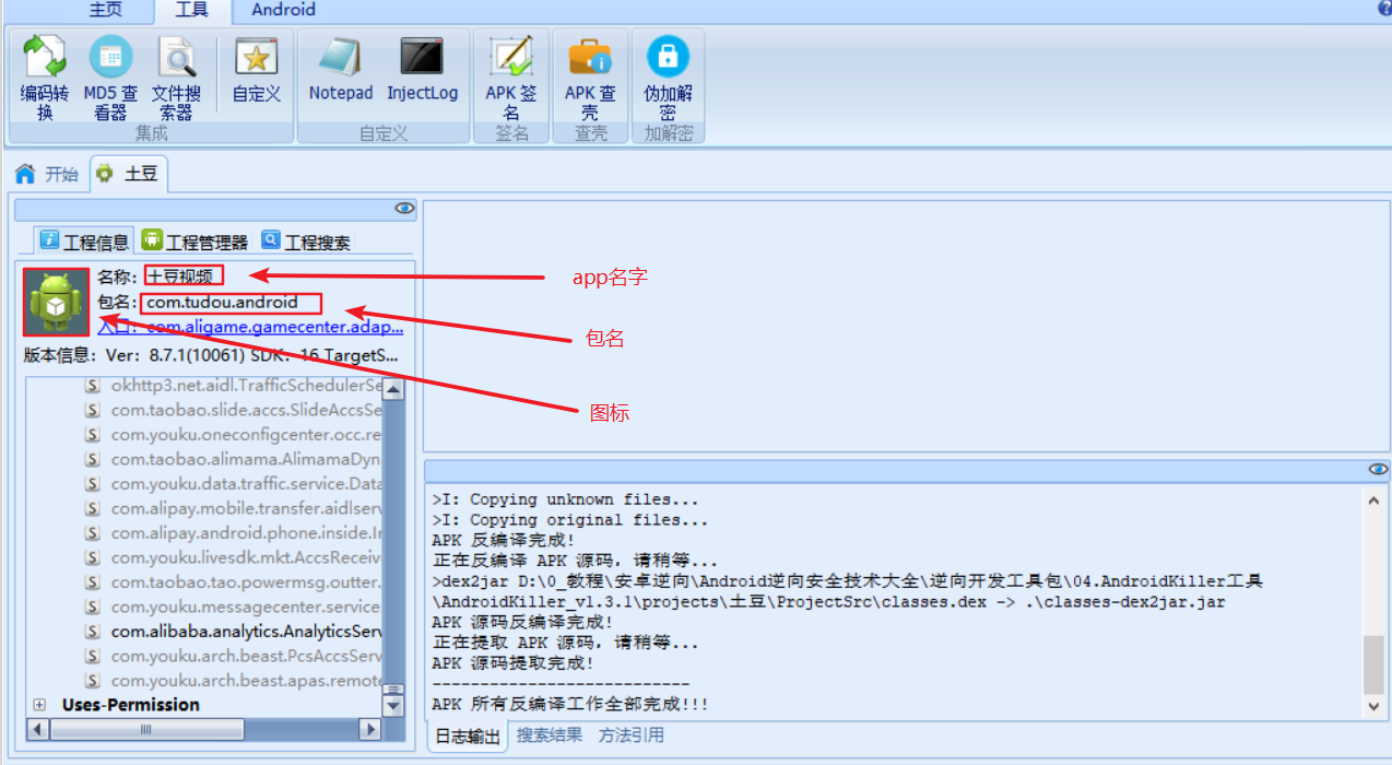 打开工具AndroidKiller,将土豆.apk拖拽进去,时间会比较长…