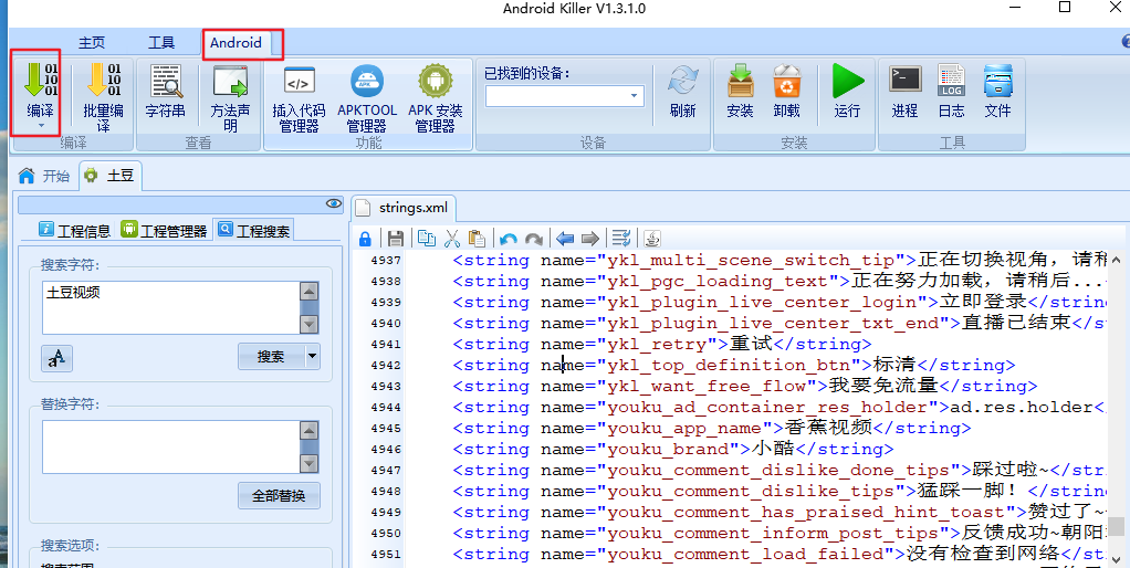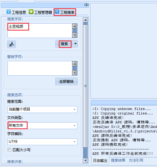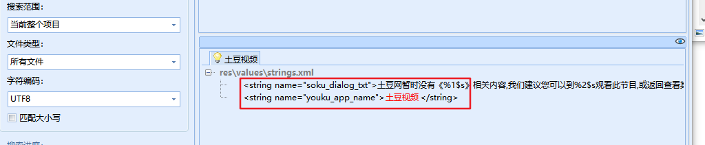点击 工程搜索 -> 搜索字符 输入 土豆视频 -> 文件类型设置成全部类型 -> 搜索,等待几十秒